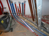 In de werkplaats heeft Peter de hoeveelheid leidingen ingepakt in isolatie, alle keine gaatjes volgespoten met schuim, zodat daarboven beton gestort kan worden en er geen 'koudebruggen' ontstaan. Ik dacht dat hij niet van puzzelen hield.......